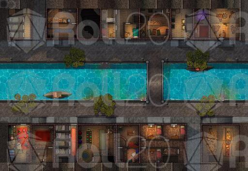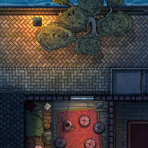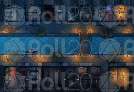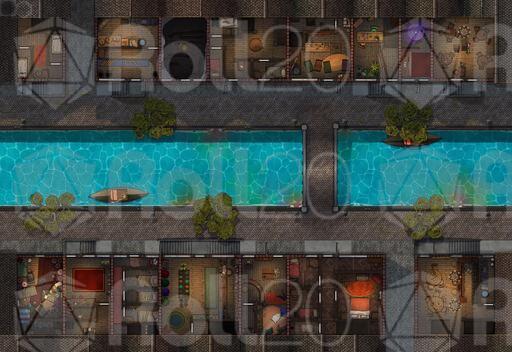 ➤ Canal Street. [32x22] Many small dwellings and businesses flank the city canals, with some having further dealings above (and below...) [🌓 Night & Day Variants] [🏨 Multi-floor Map]