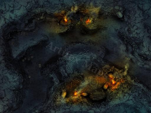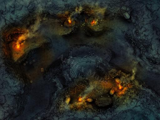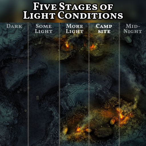 Tomb of the Dead: The Valley is where your journey towards the depths of old gods past start, or perhaps it ends here? This is our latest release map from our Horror-themed map collection. The Valley is a 40x30 grid sized battle-map, hand-crafted in 3K resolution with hand-drawn assets and stamps! This Set contains Five Unique layouts to the Lighting Conditions of this battle-arena, you will find a map to suit your needs from total darkness to fully lit camp site! We also included a bonus-scene with extra-dark night, for that spooky Halloween-Session Atmosphere!