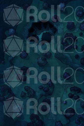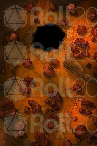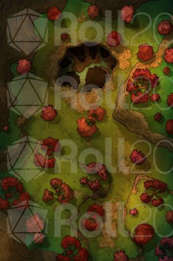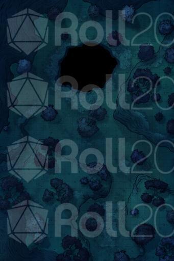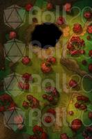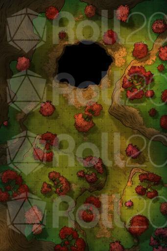In the center of the clearing, a large hole opens in the ground. It's no ordinary cave; from the entrance, a faint glow can be seen, as if lit rivers or crystals shine in the darkness. The air rising from below is cooler and smells of minerals and damp stone.