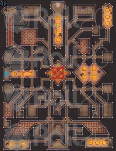 Adventurers appear in the central room, faced with a choice of eight stone doors. The doors in the Fire Node are large stone constructions with brass fittings and are edged by ample cracks which allow fire creatures to seep through.