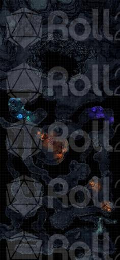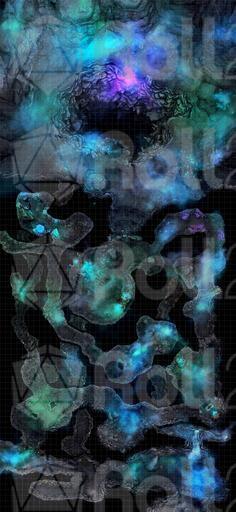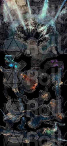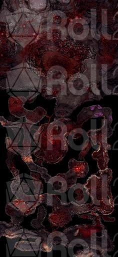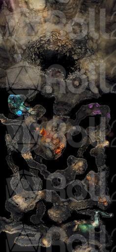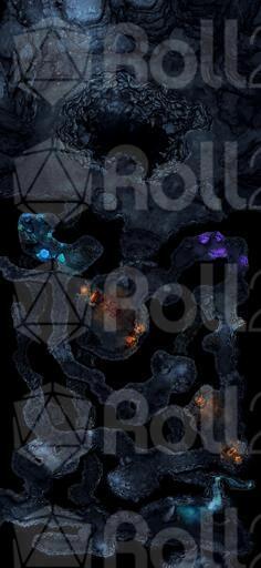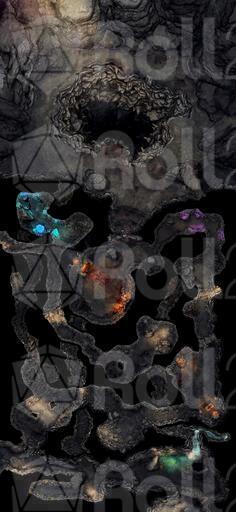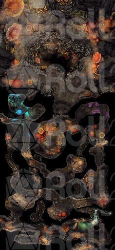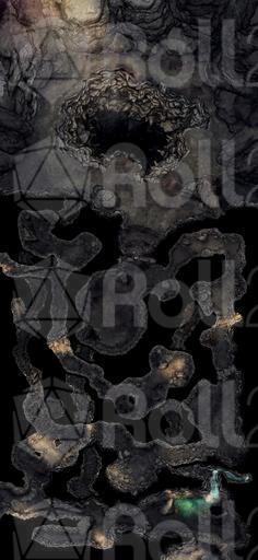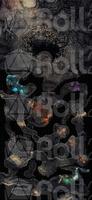 The Cultists’ Depths are a maze of winding tunnels, slick stone, and chambers carved for grim rites. Narrow passages twist unpredictably, with multiple hidden and underground paths leading to shrines, altars, and crude statues raised in the name of primitive deities. A great cracked stone furnace, both idol and sacrificial pyre, dominates one chamber, while others hold rough altars and symbols daubed in blood and soot. At the map’s heart lies a vast cavern where the rock falls away into an immense black pit. The edges are scarred by strange carvings, as though the cult believes the darkness itself is sacred.