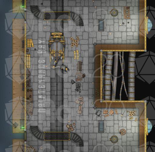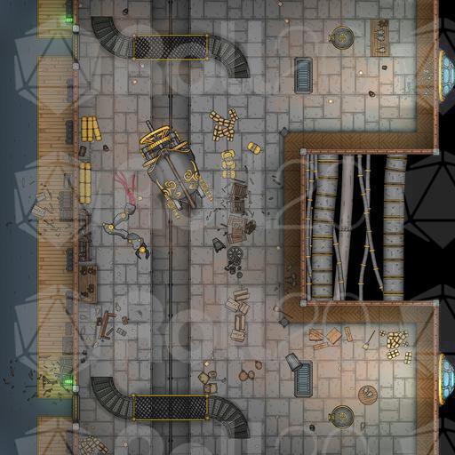 This pack presents two detailed battlemaps depicting the aftermath of catastrophic damage aboard the legendary Brelish floating fortress. Designed to perfectly match the layout and style of the original Argonth Mobile Fortress pack, these ruined versions allow GMs to seamlessly transition from fully operational environments to tense, derelict, combat-ready scenarios.