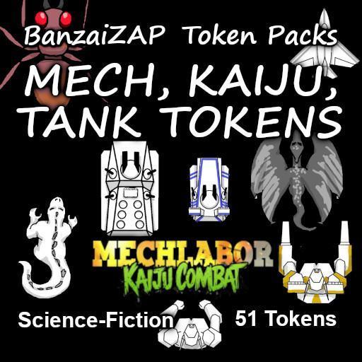 Mecha! Monsters! Military Hardware! This token set was made for the game "MechLabor: Kaiju Combat!" (available on DriveThruRPG) but can be used for any game featuring giant robots and monsters. Included are five battle robots, five kaiju and seven pieces of military hardware like tanks and helicopters to be used in your favorite VTT. It even has the mighty Laumer-class Battle Tank! (Often called a BOLOGRE. Nobody knows why.) Each piece comes in three versions: Line Art, Grayscale (for tinting) and a simple Color version. This token set will also be part of the VTT DLC bundle for MechLabor: Kaiju Combat, so you can save a bit with the whole bundle that includes maps and expanded rules.