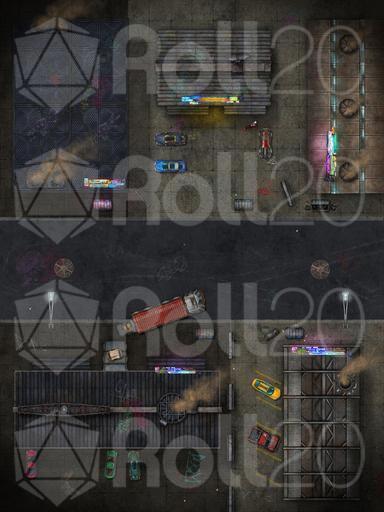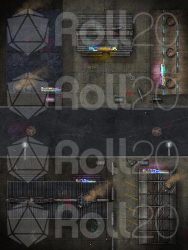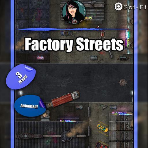 Hit the streets! The air may be choked with acrid smoke, the roads unmarked and dangerous, and the local denizens less than friendly, but this is a place of business, and business doesn’t need to be pretty. What manufactured output flows from these insalubrious halls of industry – food products, machinery, weapons, or goods far more pernicious still? Perhaps the local dive where exhausted workers and disenfranchised locals linger might hold the answers. Available in two variants, the streets at night and by day without vehicles, this fully animated map is sure not to meet the slightest environmental guideline!