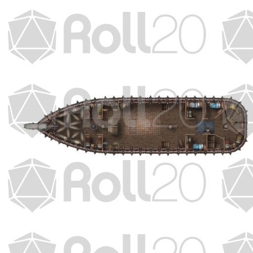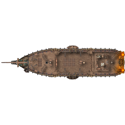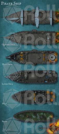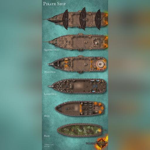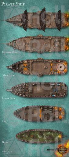 This massive sailing ship is festooned with gritty piratey details to delight and terrify your players. Fight, deck by deck, down from the rigging to the putrid bilge below deck. Uncover treasure, free prisoners, or flip the script on its head, and reward your black-hearted plunderers with a ship worthy of their ill-repute.