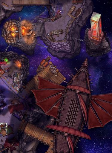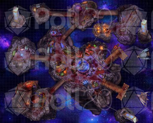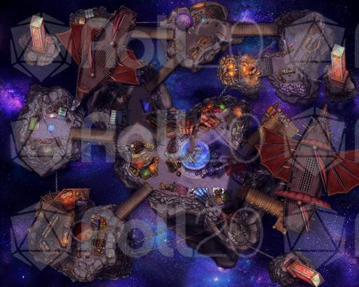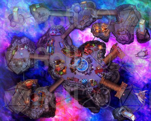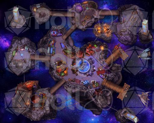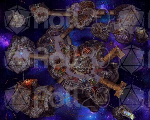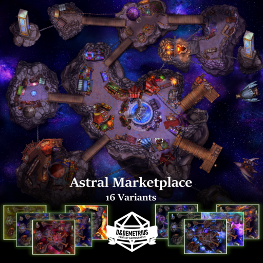 The Astral Marketplace drifts upon islands of broken stone, each one afloat in the cold black of the void like scraps of a shattered world that never cared to fall. Every isle bears a merchant’s stall or a crooked tent of star-silk, where strange wares are traded by hands that tremble at heights that have no bottom. Semi-floating bridges stretch between them, swaying though no wind can be felt.