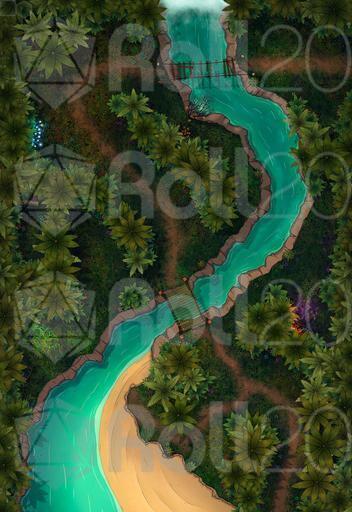 ➤ Eirubamba River. [22x32] A winding river stretches throughout jungle paths, failed bridges, and overhead trees.