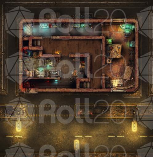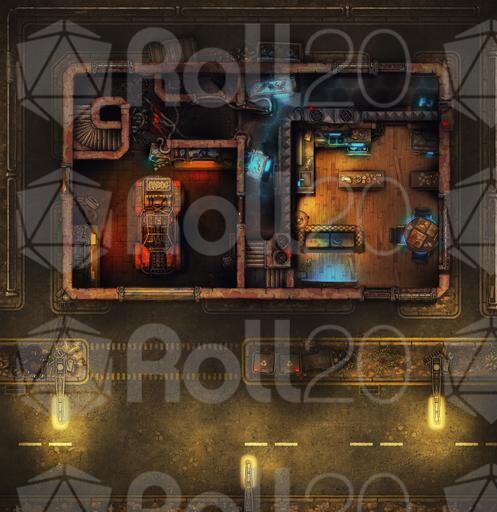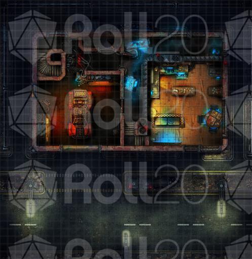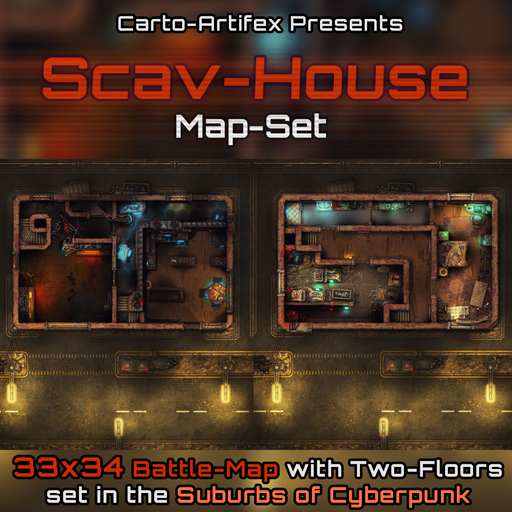 Scav-House Map-Set gives you great encounter location for your Cyberpunk adventure! This Set contains four versions of our 33x34 Battle-Map with two playable floors. Inside you can find four alternative versions of our two-story map, you can decide the time of day with two ambience: Night-Time or Morning-Haze, the Default layout is a two story apartment building set somewhere in the near dystopian future. You can find location with multiple entry ways and strong story telling hooks and hand placed detail with hand-drawn assets! In addition to time-of-day variations, this set also contains two bonus-scenes for you to craft your narrative around, the Night-Time Raid gives you solid boss-arena or challenging combat arena for your players, are you defending the fort, or are you the one after the safe filled with eddies upstairs? If you want to play it cool and stealthy, you can pick our another Bonus-Version: The Nobody Home gives you empty layout in the day-time when the Scavs are out for errands, maybe install some bugs in the crawl space, or jack into their system to see whats up!