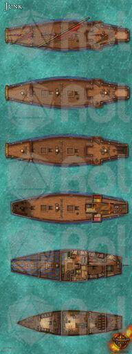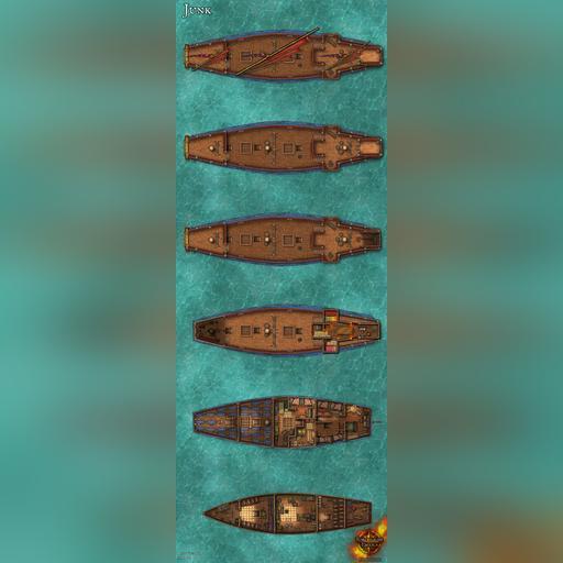The Junk is a classification of ancient Chinese ships that could range in size from small fishing boats to truly gargantuan treasure ship. What made them alike was they all utilized battened sails, watertight compartments, and stern-mounted rudders, all marking them as sturdy and reliable. With this fanciful interpretation I hope to add a little bit of that variety to your campaign, be it as a base of operation, a transport to new lands, or a feared rival on the seas.