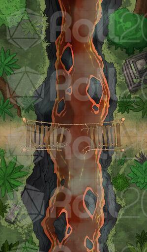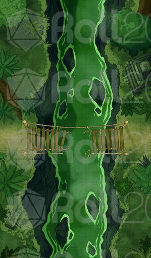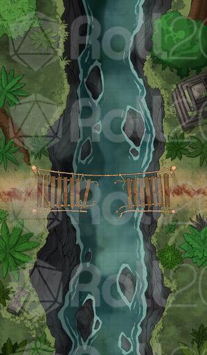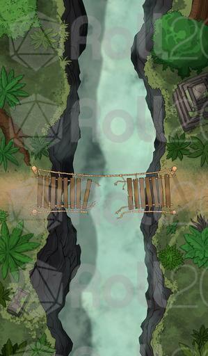 A dextrous and quick jungle denizen slipped through the party's fingers. They chased him on his home turf, as he carried vital information of that elusive shaman's whereabouts. As if mosquitoes, vines, barbed plants that leave the eternal itch, and danger on every step weren't enough, the bridge collapsed. The young man grinned at them from the other side and waved. As he was to run away, something dark emerged from the gorge, pulling him down. His scream echoed long after he was gone, as the dreaded silence fell. His pouch fell from his belt, on the other side. Between the party and the pouch is a broken bridge - and whatever lurks below.