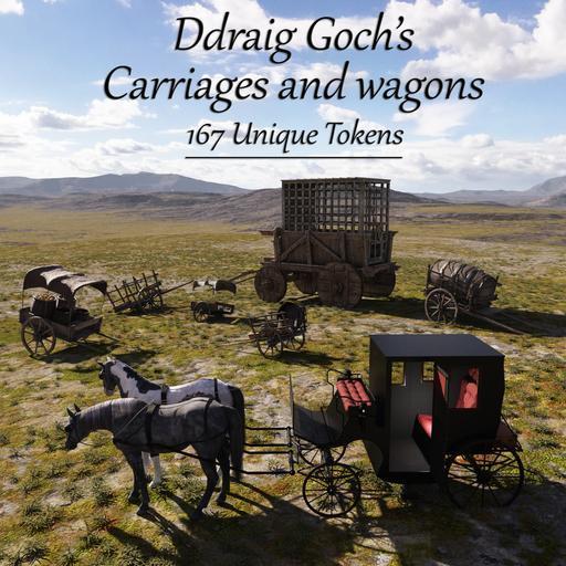 This product depicts 167 uniquely designed 3D rendered tokens to be used in your fantasy role-playing games. A lot of adventures carry you from place to place, but how best to get there than in carriages and wagons. Goods need to be shipped from farm to village, to city.