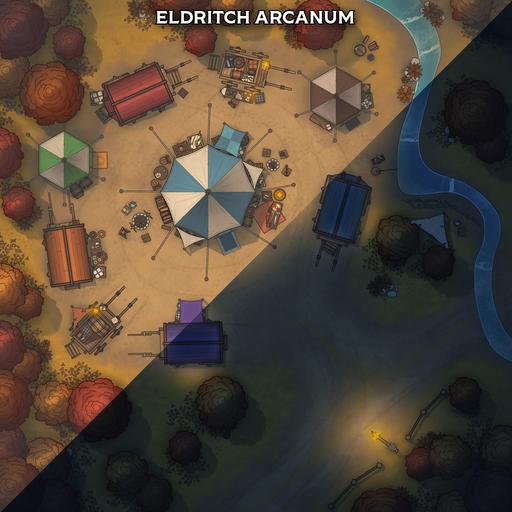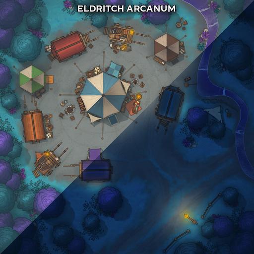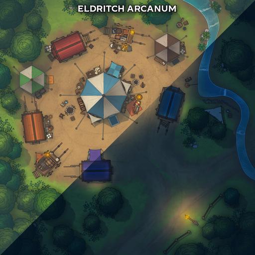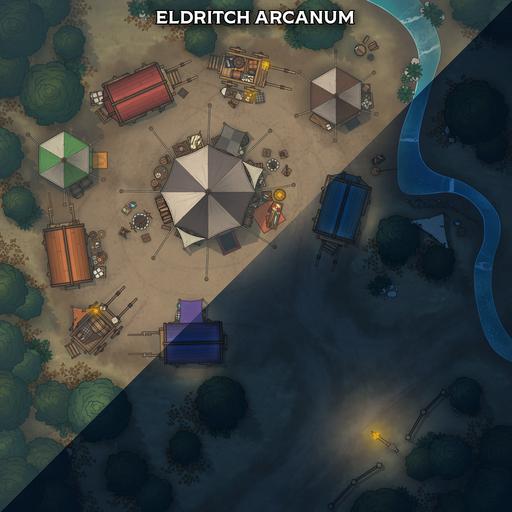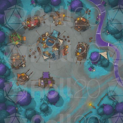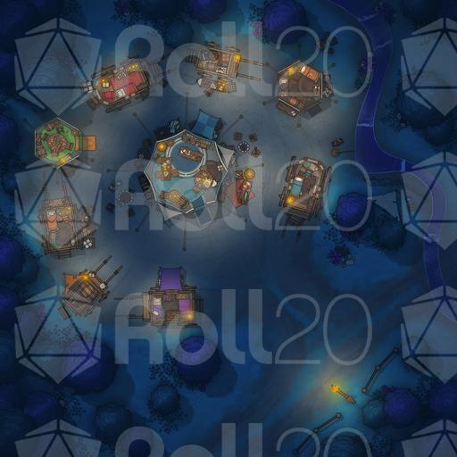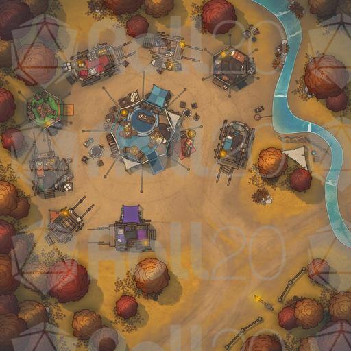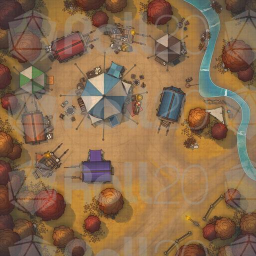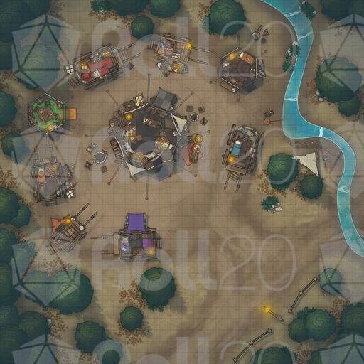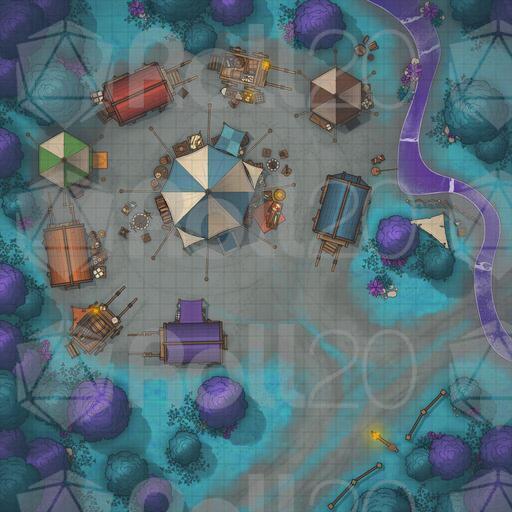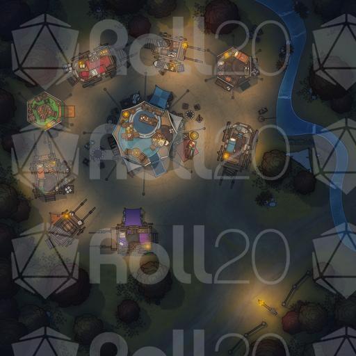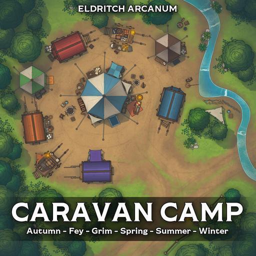 A flexible travel-stop battlemap pack focused on the Caravan Camp, ideal for merchant negotiations, ambushes on the road, suspicious visitors after dark, and campfire roleplay.