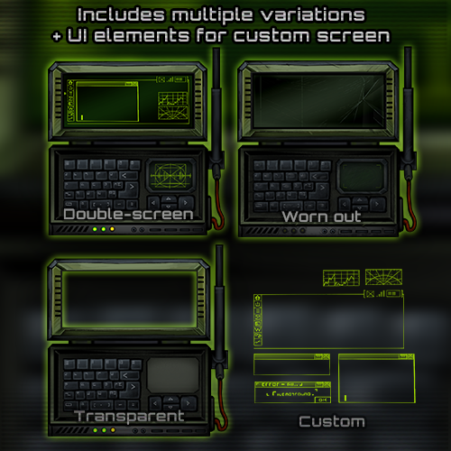 Inside you will find six templates with various screens and effects, in addition you can find a transparent version for clean and broken cyberdecks for your own take!