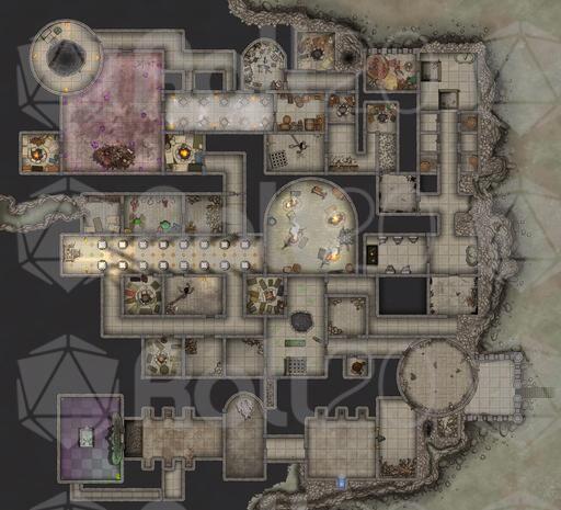 A fortress emerges from the darkness. The subterranean citadel, though impressive, seems long forgotten, if the lightless windows, cracked crenellations, and leaning towers are any indication. All is quiet, though a cold breeze blows up from below, bringing with it the scent of dust and a faint trace of rot.