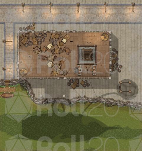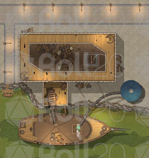 Behind the warehouse spreads a gray-green pit of mud. A huge, rickety crane protrudes from the far wall of the warehouse. Dangling from it is the dripping hulk of a ship, hanging some fifty feet above the greasy mud.