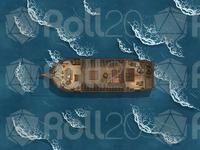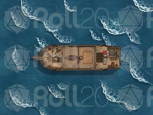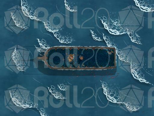 Though the light is dim, you can see details of the ship's main deck. In the center, forward of the mast, a jolly boat is lashed to the deck with ropes.