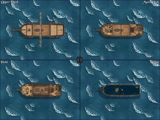 Two human figures lean against the rail mid-deck, staring toward the coast. To fore and aft, below the upper decks, stand vague outlines of doors. You can also see ladders that lead to the upper decks, the aft one on the port side, the forward one on the starboard.