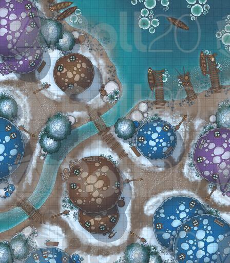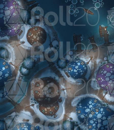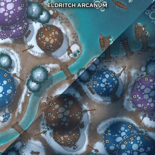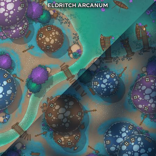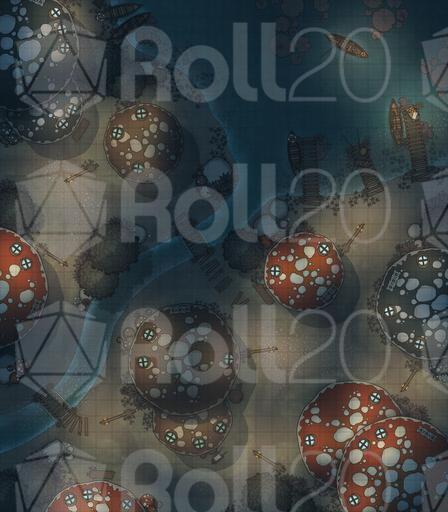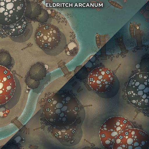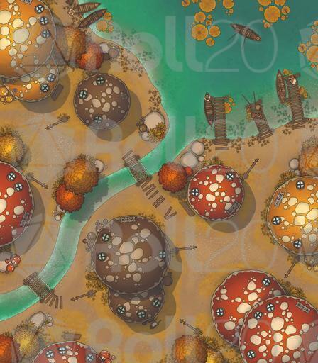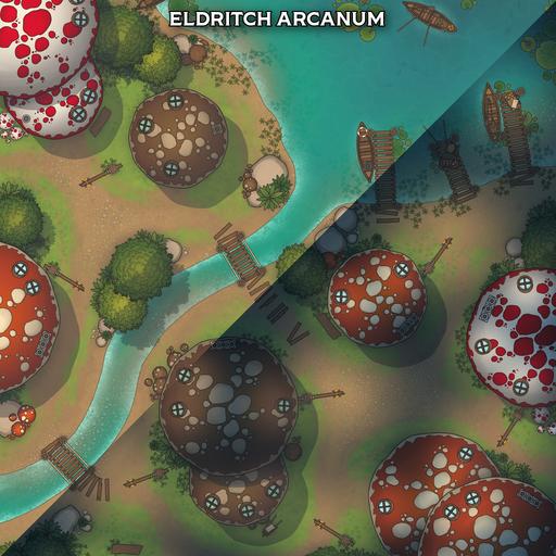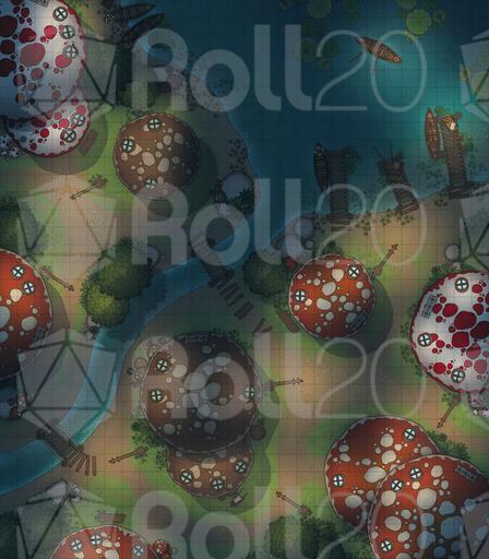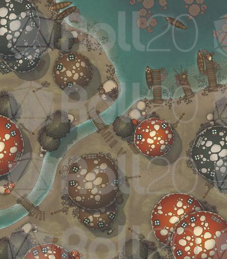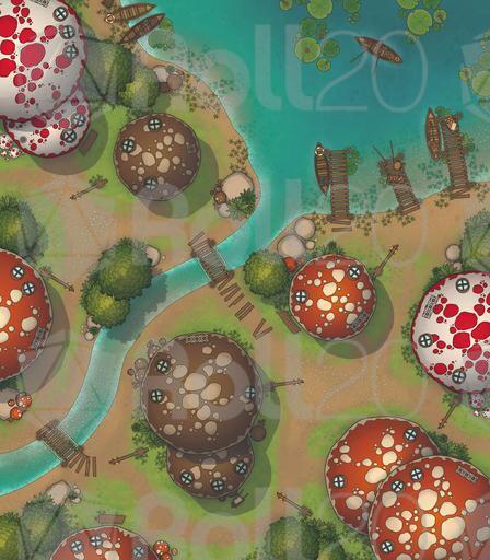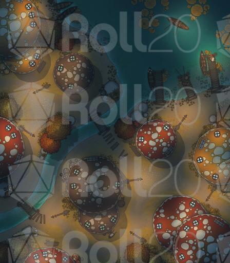 A vibrant settlement battlemap pack focused on the Mushroom Village, perfect for whimsical roleplay, fey-troubled errands, unusual local customs, and conflicts among the lantern-lit caps.