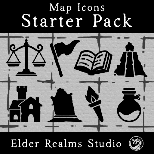 A Fantasy Map Icons Starter Pack in Black & White for VTT maps. Including 62 unique icons with two versions each: bordered and borderless (124 files total)