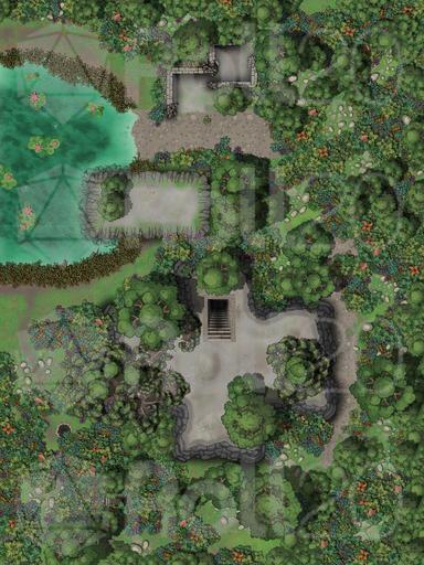 All that remains of a once-grand city are a series of ruins, now mostly hidden by thick jungle foliage. A swamp filled with standing reeds and colorful aquatic plant life close the ruins’ western edge. The occasional gurgle and bubble of something, moves beneath the water’s surface.