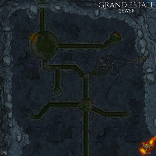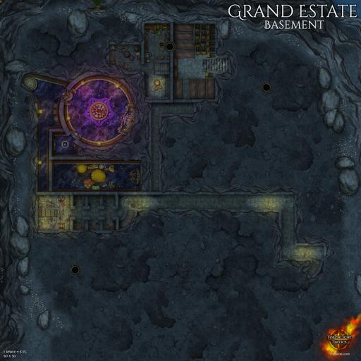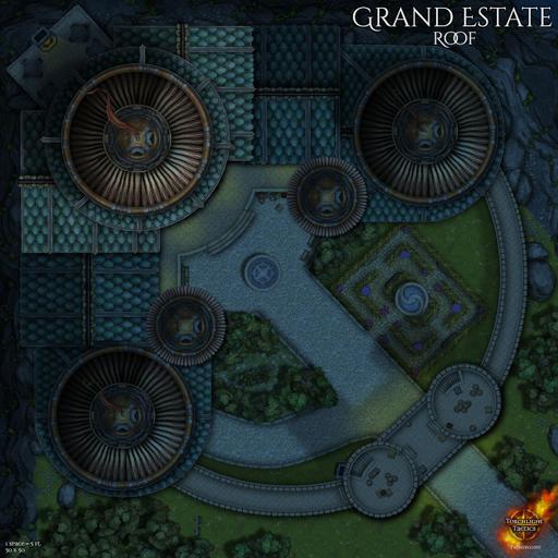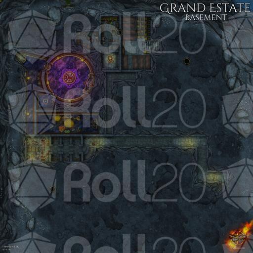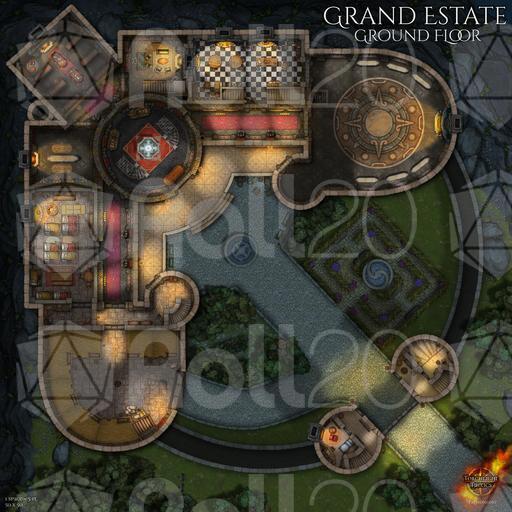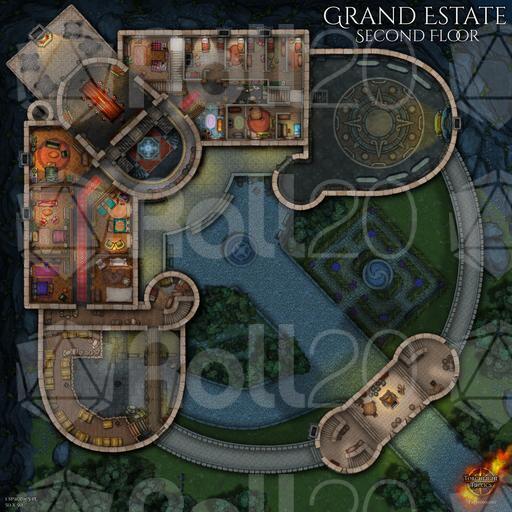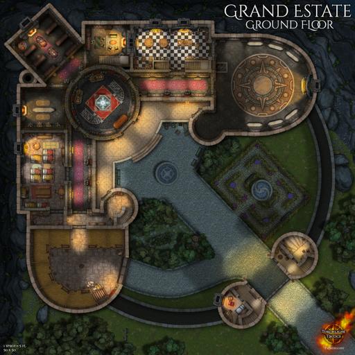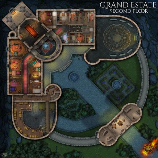 The Grand Estate is a sprawling map, with three stories upward and two sub floors. A gatehouse guards the only entrance in and out, so one may need to sneak in via the sewers running beneath, or scale the walls and slink from shadow to shadow above. With a stable, a barracks, library, kitchen, and ballroom on the first floor, there are plenty of encounter opportunities, both combat and non. Upstairs houses a series of guest rooms, an opulent dining room, and a grand balcony.