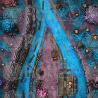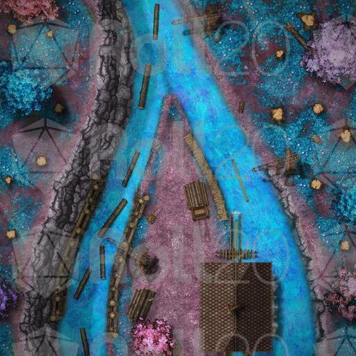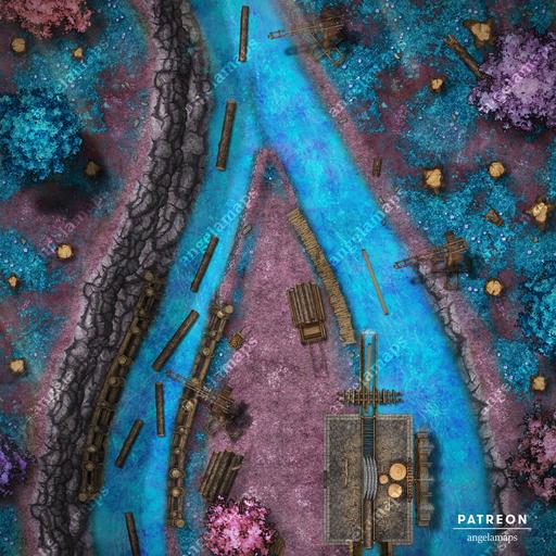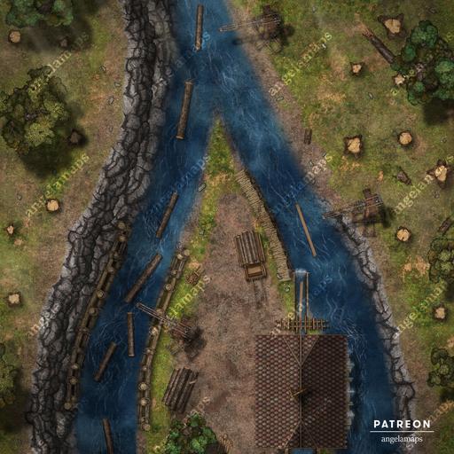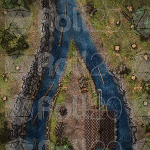 Did you see the saw? Chopping down primeval forests is one thing, turning those massive trees into useable lumber is another thing, and that's where this sawmill comes in! Employing the current of a conveniently forked river is perfect to facilitate the transport of raw materials and finished products, which also turns the water wheel that powers the massive saw! Just another industrial site where nothing might go wrong, certainly not abandoned after hauntings or attacks from the forest animals, elves, or loraxes. Fully animated and available in versions with and without the roof over the mill, as well as with the daring settlement of this installation in a fey land, clearly instruct your party to keep their hands and fingers away from the machinery at all times! It's been 0 days since the last accident...