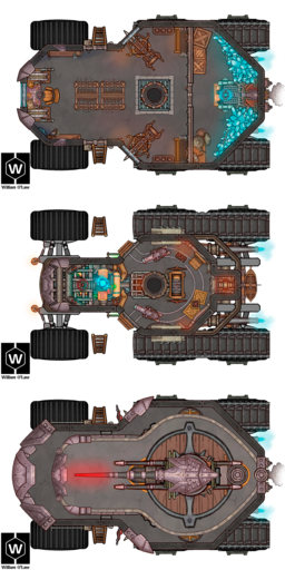 This pack includes four detailed steampunk tank variants: two combat models and two transport versions, designed for tactical encounters, war campaigns, and high-magic industrial settings.