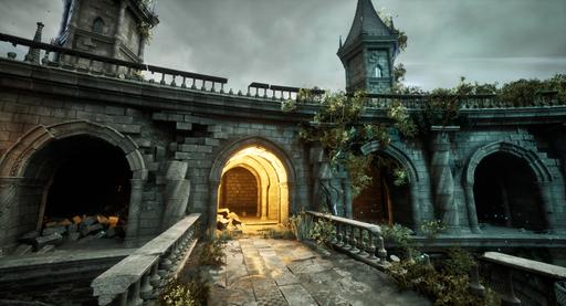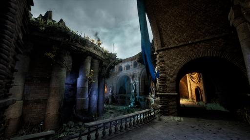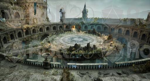 Tattered standards strain in a ceaseless wind; stone figures are half-buried in living roots.
