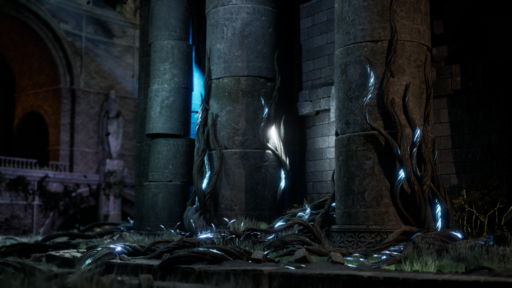 The arena is broken, but its purpose lingers. Collapsed towers bite the horizon. Ancient flags billow and fray in a wind that smells like rain and old stone. In the center hovers a wide, freestanding platform. The kind of place where legends end (or begin). Roots, thick as columns, vein through the ruin and glow with a blue, spectral light, as if the world beneath is awake and watching.