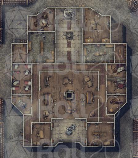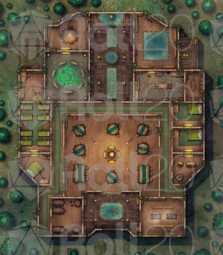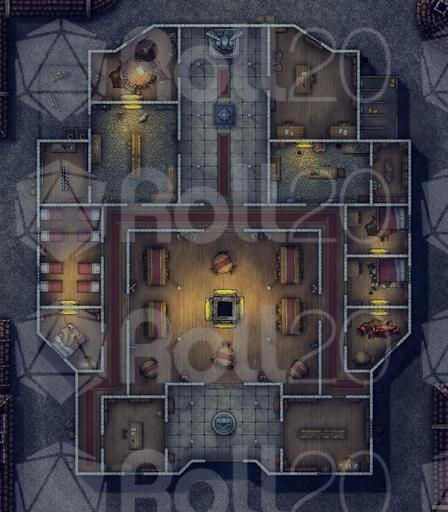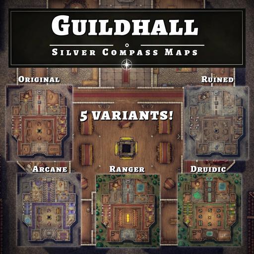 Welcome to the Guildhall! This map pack features unique guild halls for Fighters, Rangers, Druids, and Wizards. These maps may also be adapted to other classes or serve as a generic guildhall. All guildhalls include a common dining area, offices, bedrooms, strategy room, kitchen, storage, and stables. Additionally, each guildhall includes: