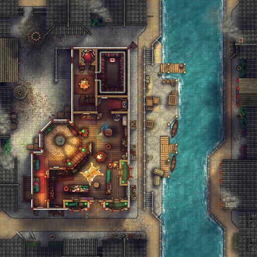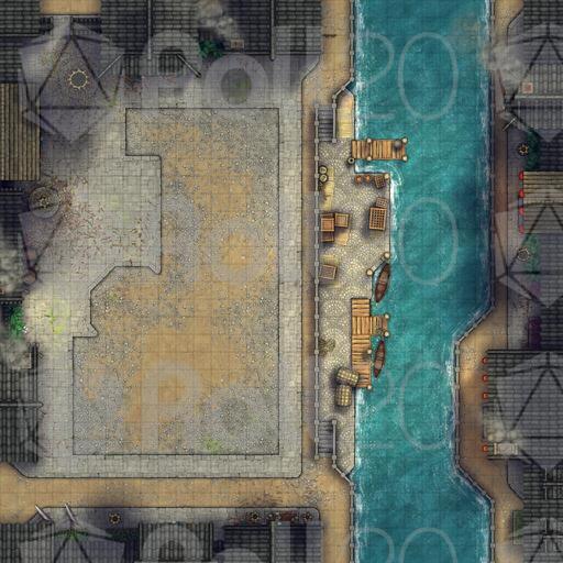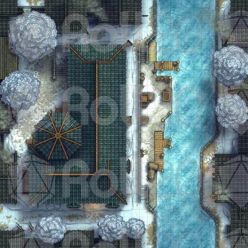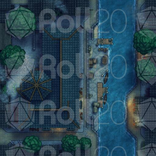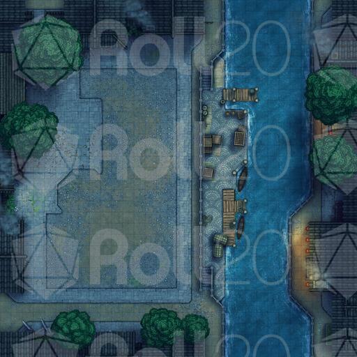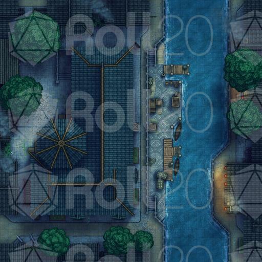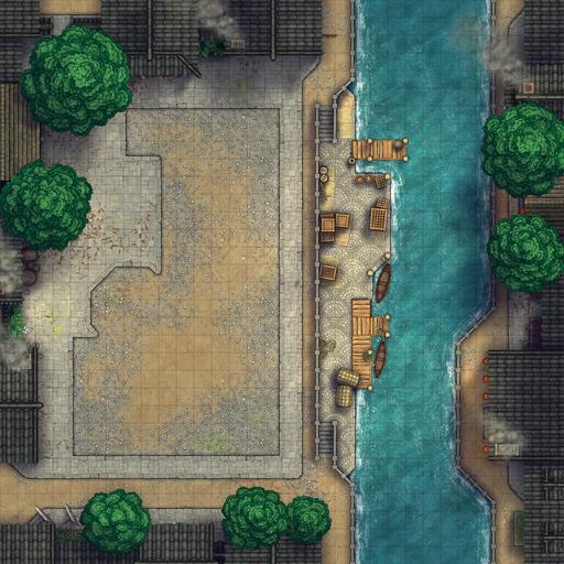 This map is compatible with the Mega Asian City Bundle tilesets! The canal connects to the 16×16 canal tiles, while the alleys in the bottom left and top left connects to the 8×8 alley street sets.