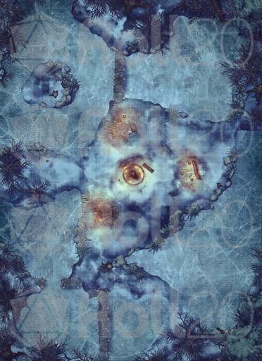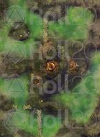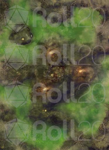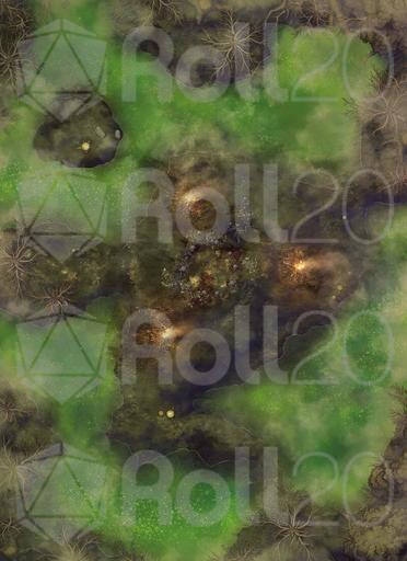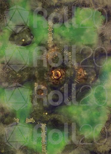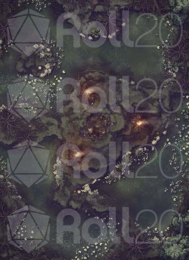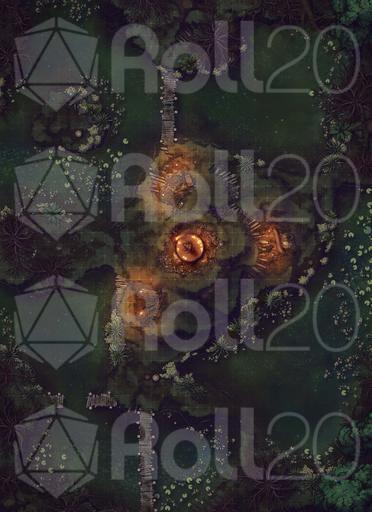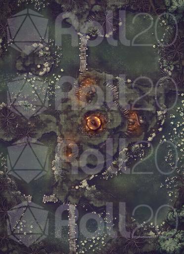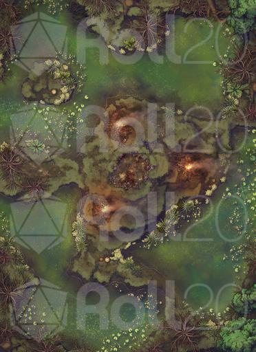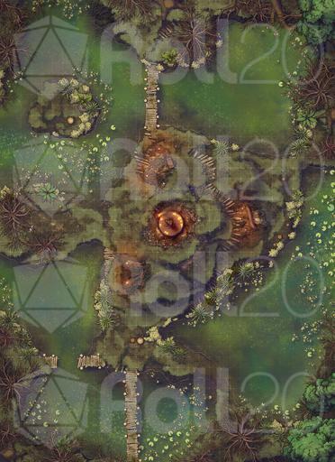Fires burn on a mound deep in the swamp, casting dancing shadows across scattered bones—some human, some not. A ring of pale mushrooms crowns the summit. Words rustle in the air, and whispers weave dark thoughts into your mind.